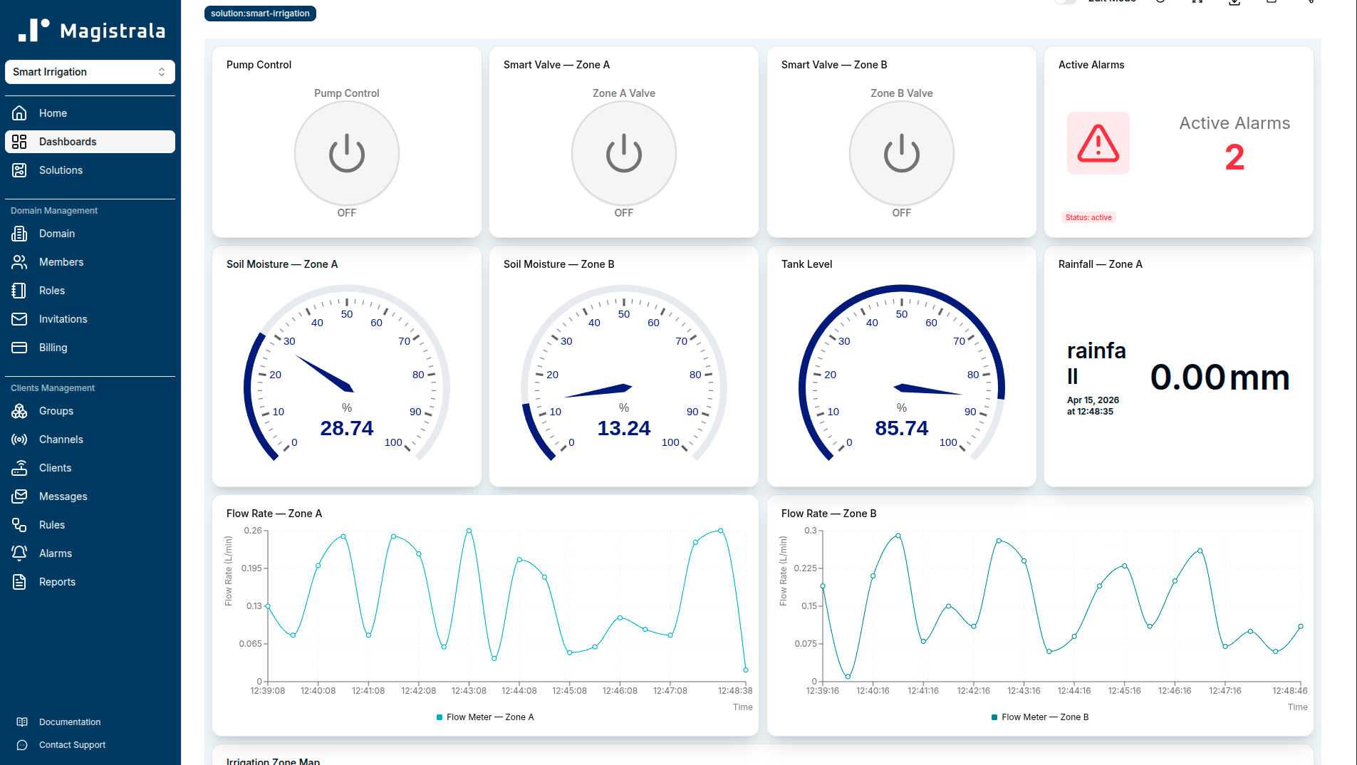 Zone-level soil moisture drives irrigation decisions rather than fixed schedules. Dry soil alarms fire before crops are stressed. Daily volume reports close the loop on water spend.